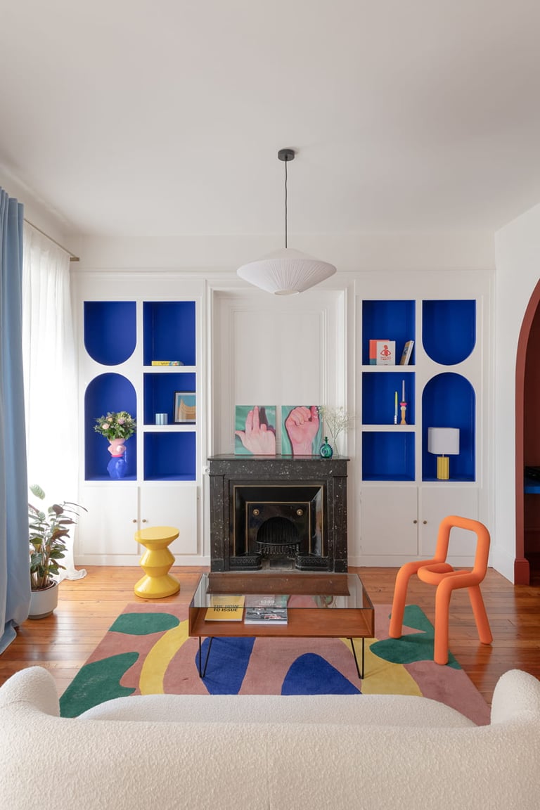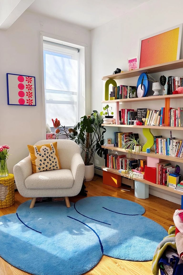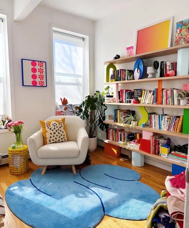 Celia's lovely living space from 'Project Jacquard' features bold hues that are sure to attract the eye. The carpet has some color reminders of the blue seen in the backdrop of the shelves, as well as some yellow from the stool. The orange chair is a lovely touch to balance everything off.