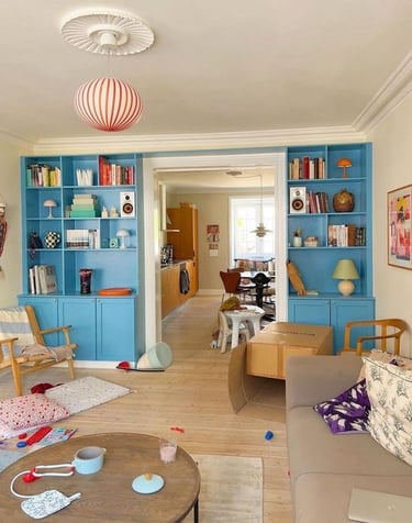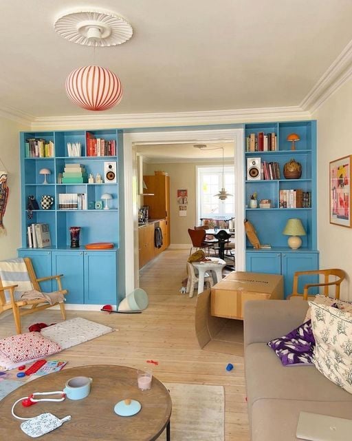 Sofie Amalie Rolandsen chose to paint her large shelves in her living room a blue ocean color to evoke the serenity and tranquility of the sea. She also uses red in other places, such on her bookshelves and ceiling lamp.