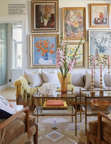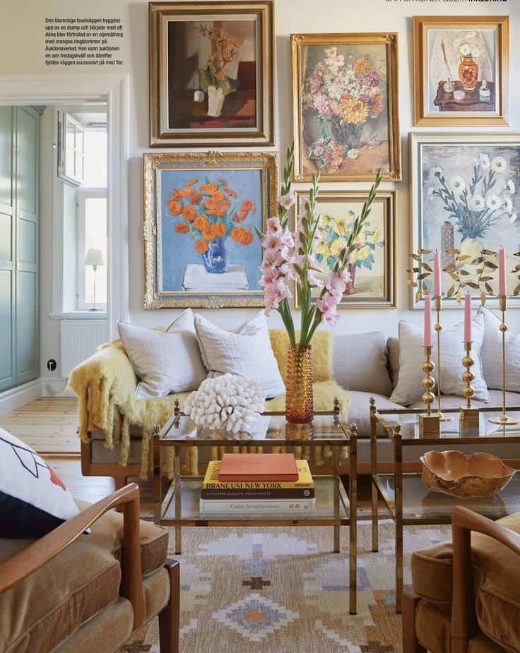 This time in softer tones, this gorgeous living room oozes tranquility with its soft golden coffee table, the delicate colors of the vintage and traditional wall pieces, the gold candle holders, and the pink candles.