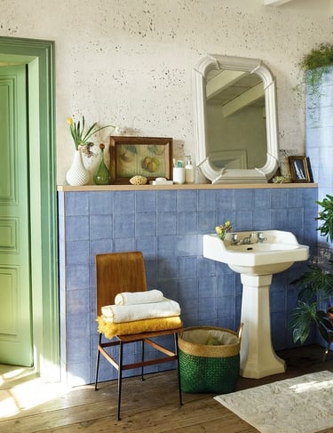 Dark blue and green make a stunning and unique combination in this living area. Again, she matched several wall art pieces, adding a lot of personality to the space.