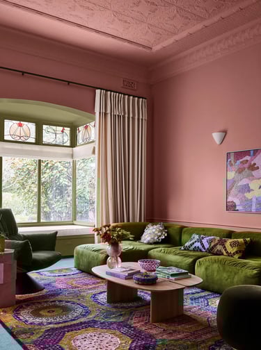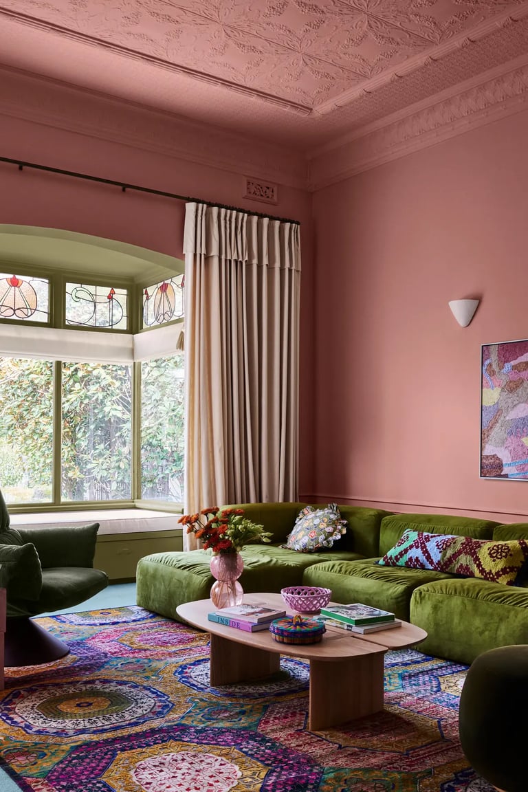 A rich color pallet of pinks and greens is ideal for a beautiful and soothing living room like this one. The patterned rug balances things out while also reminding us of some of the room's current hues.