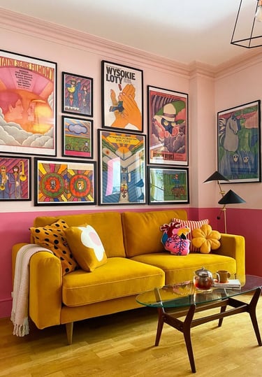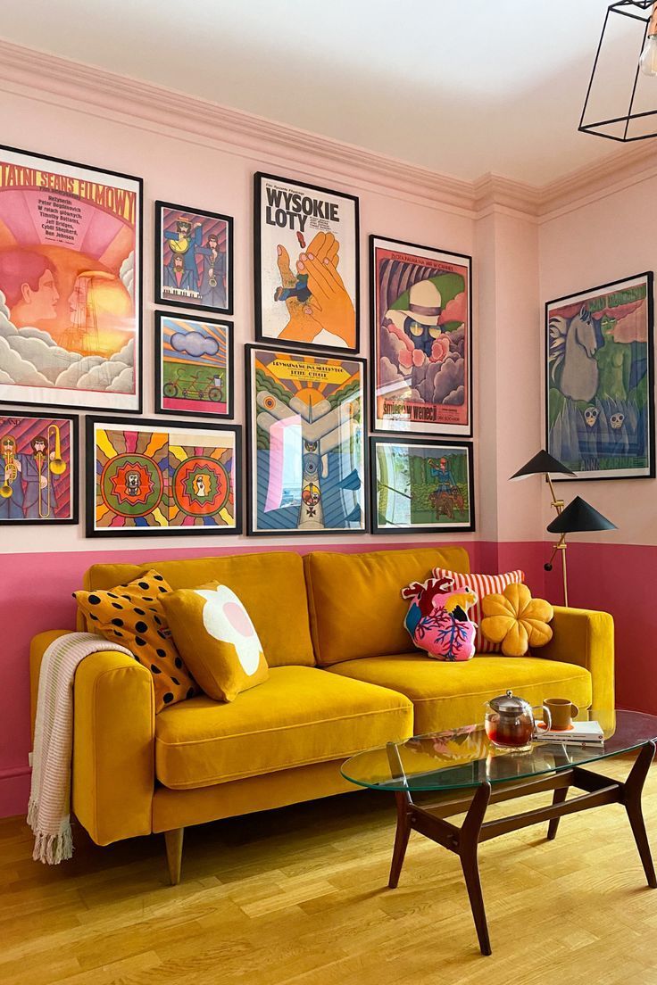 Ola Zwolenik felt that a mustard yellow couch would go well with a pink wall — and it does! She also arranged a wall gallery in various colors to give contrast.