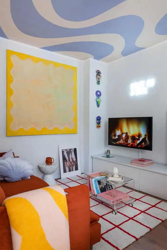 What truly differentiates Agi's living space is undoubtedly her wavy-patterned painted ceiling. There's also something extremely relaxing about the environment, which is most likely due to the ceiling, that balances out the straight-lined patterned rug and the imposing yet gorgeous wall art.