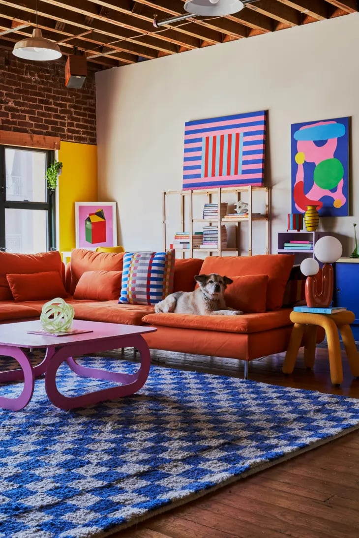 Once again, this living area is quite unusual with its single pink and yellow painted wall that instantly energizes the space. Another major feature that significantly contributes to the overall atmosphere of this room is the orange sofa.