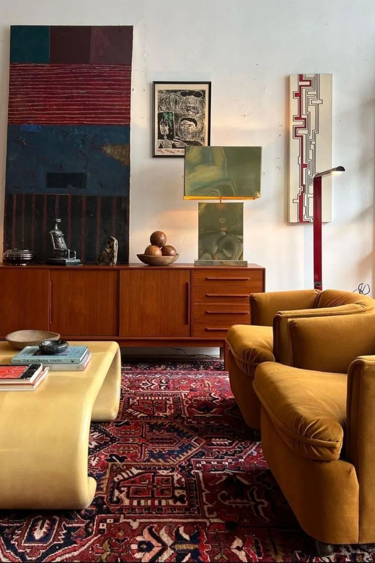 Who said you couldn't use darker, more natural hues to create a colorful home? With its mustard yellow chairs, green lamp, and deep wine red carpeting, this mid-century living room is just gorgeous. It's always a yes when opulent wood and these hues are combined.