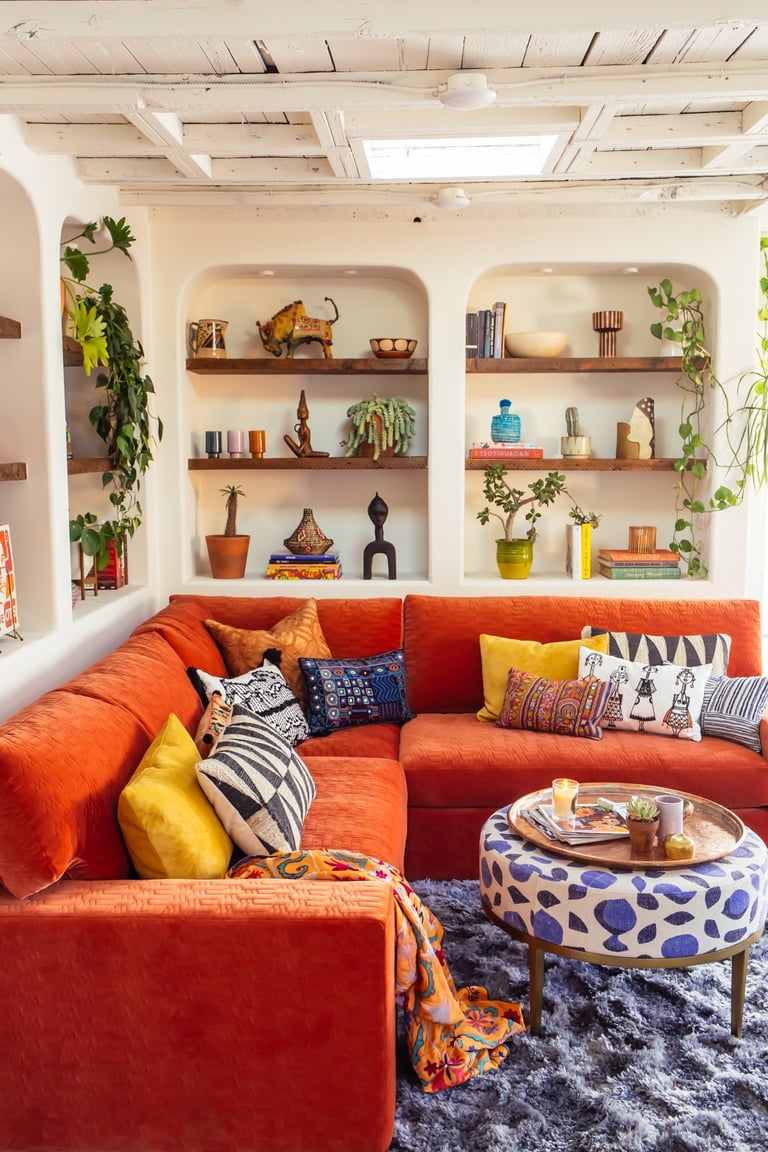 Justina combined outdoor elements with inside objects. However, her burnt orange sofa, blue shaggy rug, patterned coffee table, and colorful cushions all give off savannah experiences.