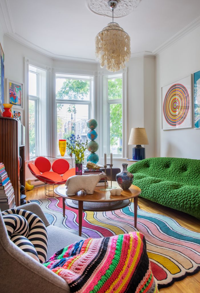 This bright and vivid living room attracts more than just the eye. It draws you in, most likely because of all the unique decor you can spot the more you look at it.
