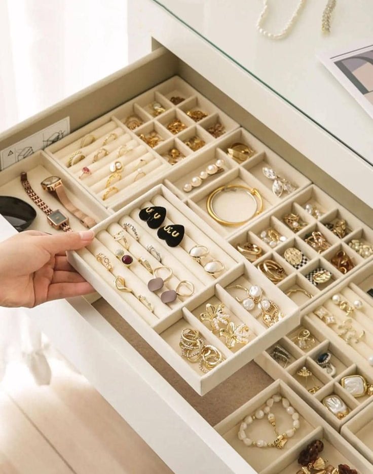 Find a jewelry box or stand that separates different types of jewelry, preventing tangles and making each item easy to find.
