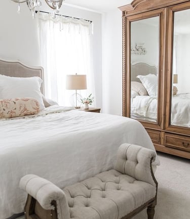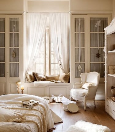 Give a French touch with decorative curtains. You can go for the classic beauty of white lace, the plush feel of heavy drapery, or the charming Toile De Jouy patterns, depending on what suits your bedroom's look and feel.