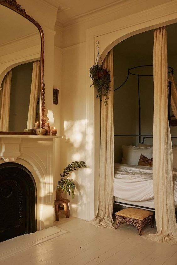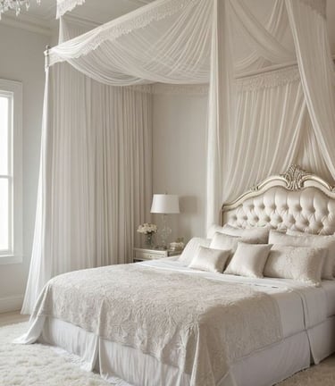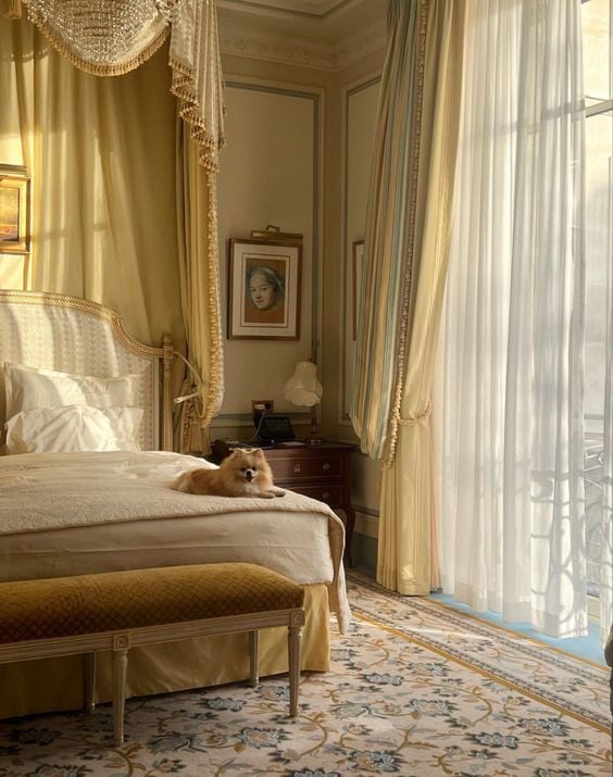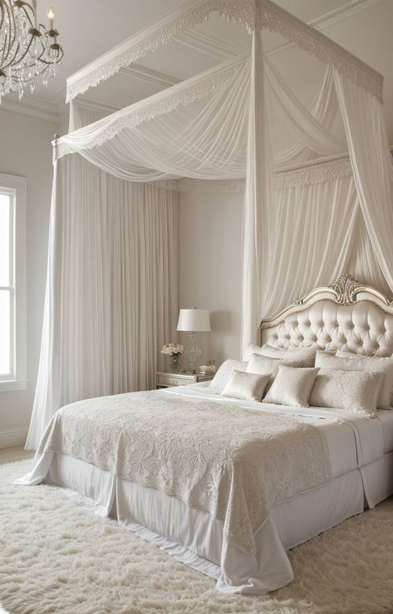 Canopy beds with elegant curtains exhibit a royal, luxurious Parisian look, particularly in larger bedrooms.