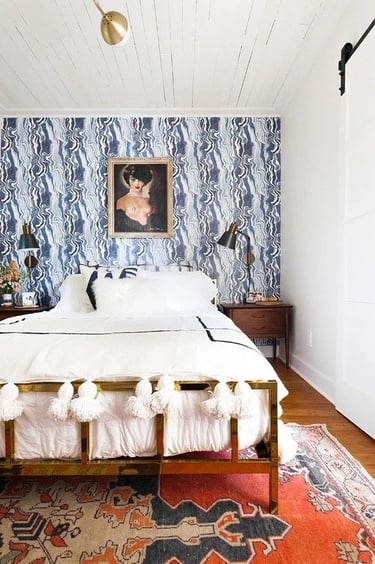 A bedroom's center point is frequently the space behind the bed. This spot can benefit from wallpaper to create a visually interesting focal point that grabs the attention and draws the eye around the space. Additionally, wallpaper is available in a vast array of textures and patterns that may give your bedroom depth and dimension, which will make it appear larger. Wallpaper can give your bedroom a feeling of richness and warmth, whether you go for a strong pattern or a subtle texture.