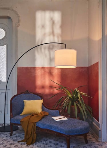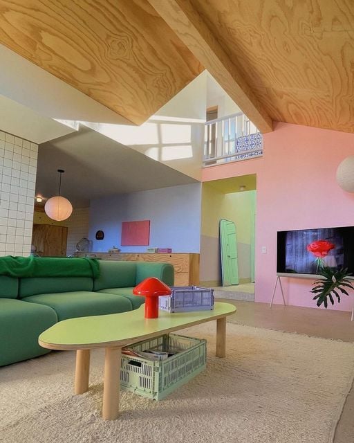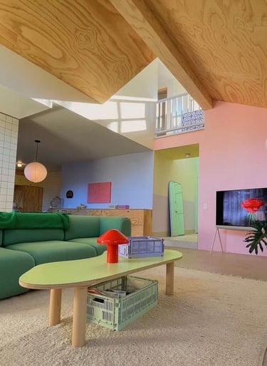 Bethany has made her living room more cheerful by painting the walls in vibrant pink and blue, which adds to the tranquil and vibrant atmosphere of her area.