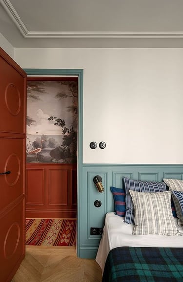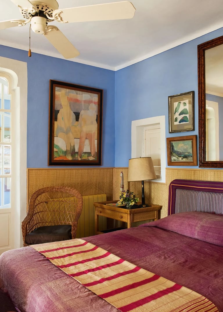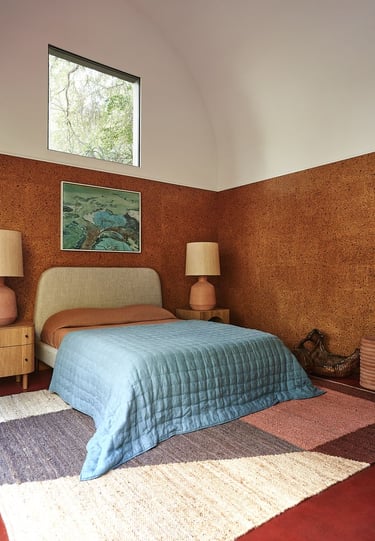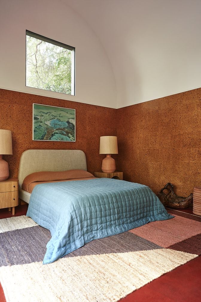 The bedroom takes the home's bold color scheme to the next level. The ocean blue contrasts well with the terracotta walls.