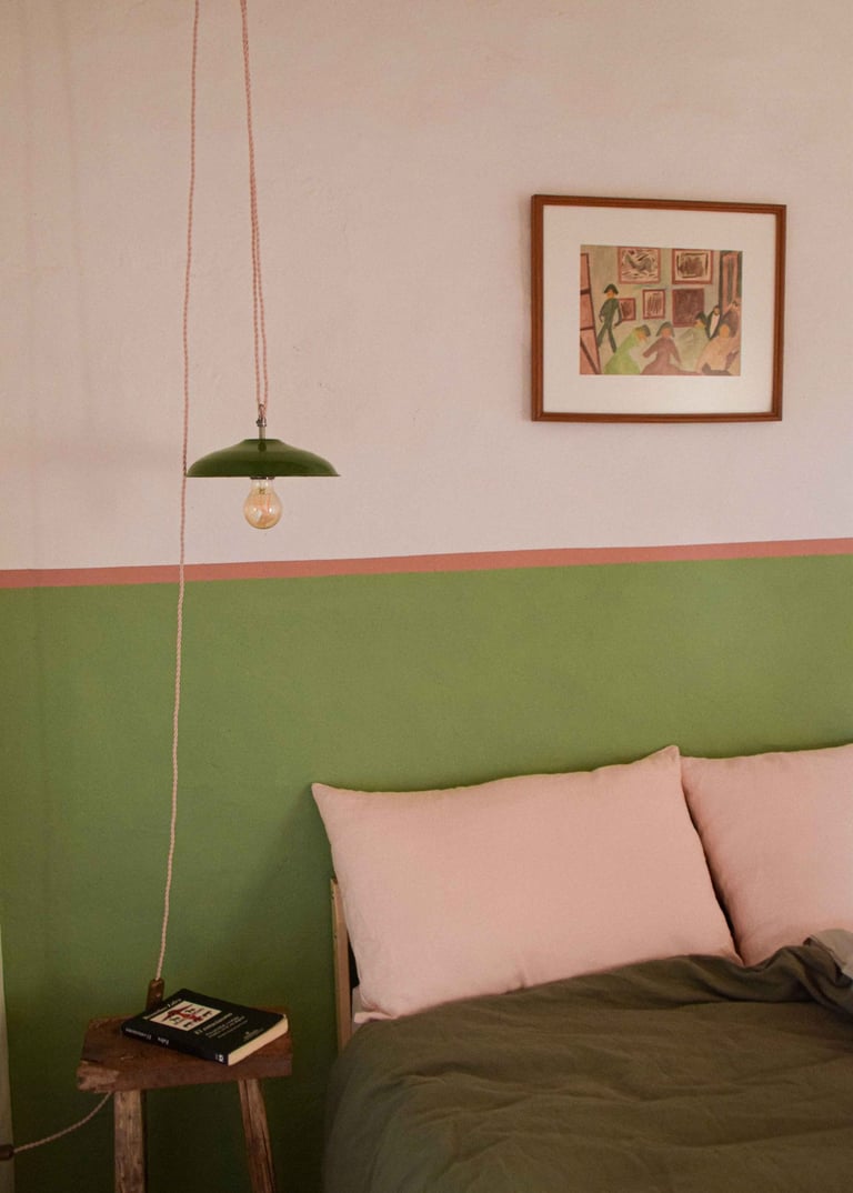 Elegant and understated bedroom of Ola and Adrian, with pink and green as main colors.