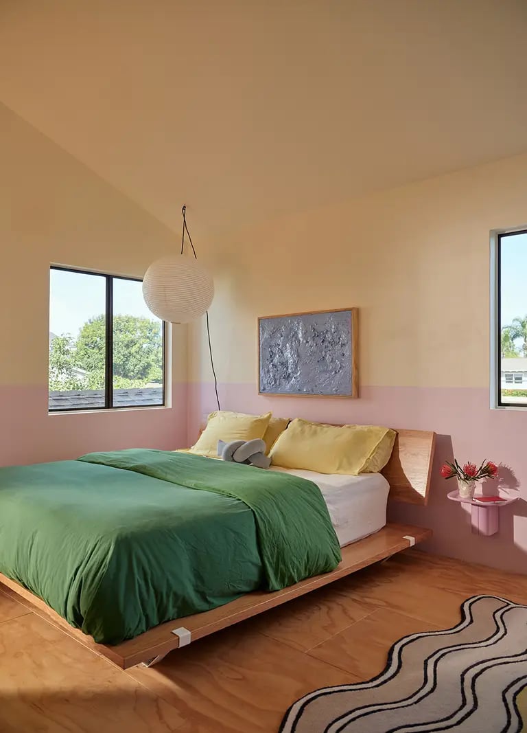 This lovely bedroom is highlighted with sunny yellow and vibrant pink, making the area appear brighter than it is.
