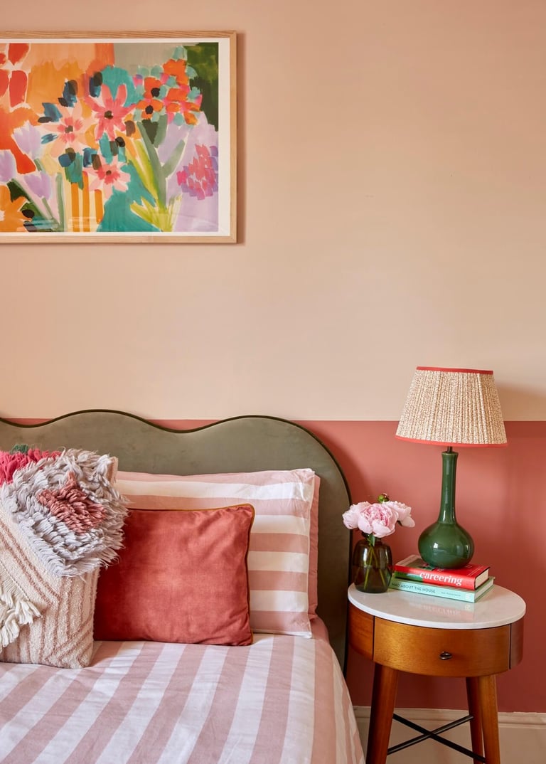A border of beige and salmon pink divides the bed from the artwork. The color palette is quite harmonious, with green, beige, and soft pink appearing frequently.